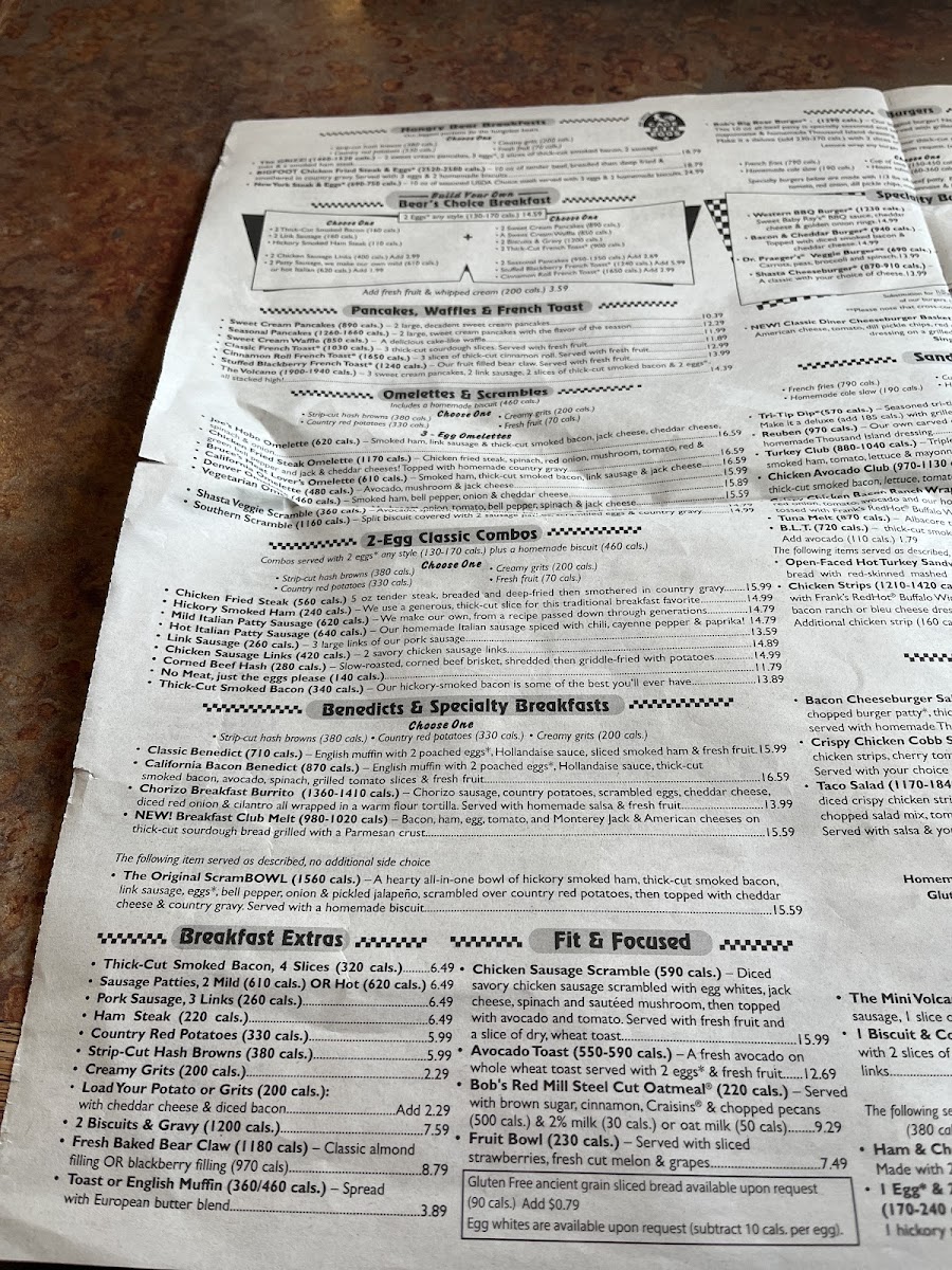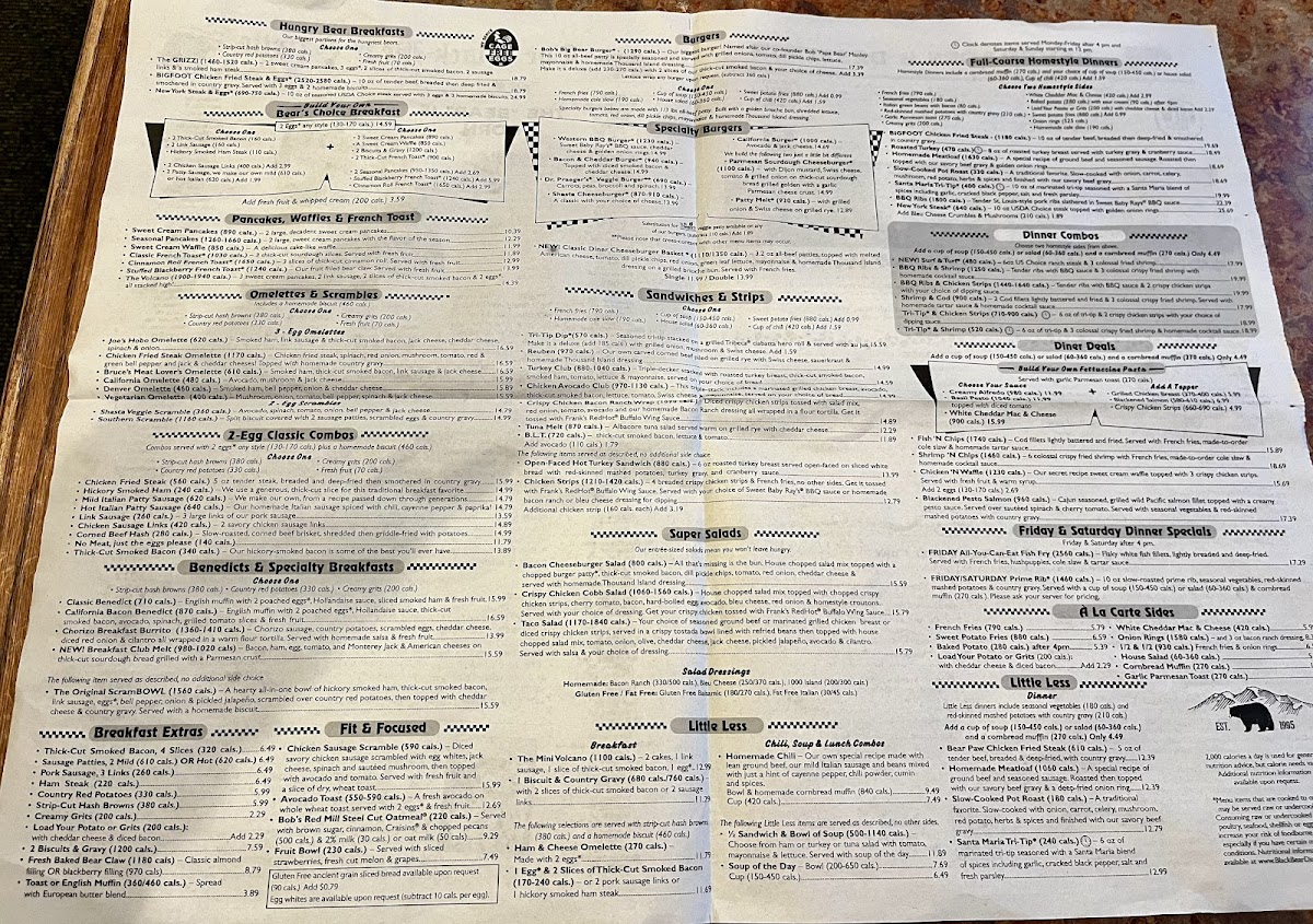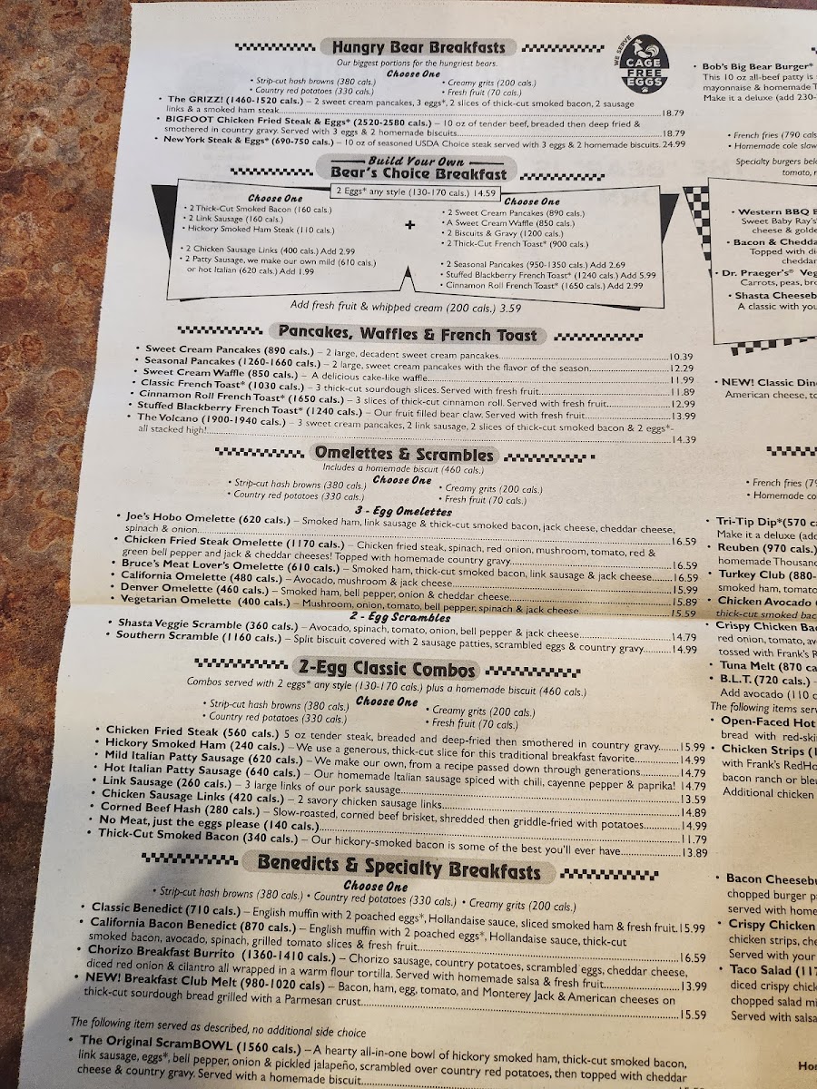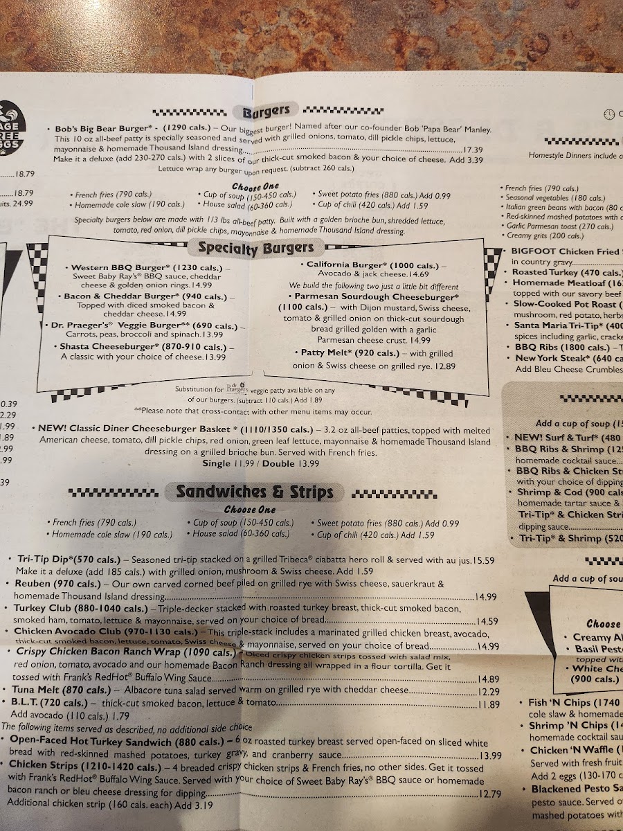 Breakfast invites guests in with warm, generous servings like Chicken and Waffles, Biscuits & Gravy, or Cinnamon Roll French Toast, perfect for starting the day or enjoying a relaxed weekend brunch. Throughout the day, the menu continues with all-American comfort foods such as the Bigfoot Chicken Fried Steak & Eggs, Prime Rib, and a selection of burgers including the Bob's Big Bear Burger and the California Burger on Parmesan Cheese Bread. Family-friendly choices and lighter options, like salads or the Taco Salad with Ground Beef, offer versatility while keeping the focus on approachable, satisfying meals.