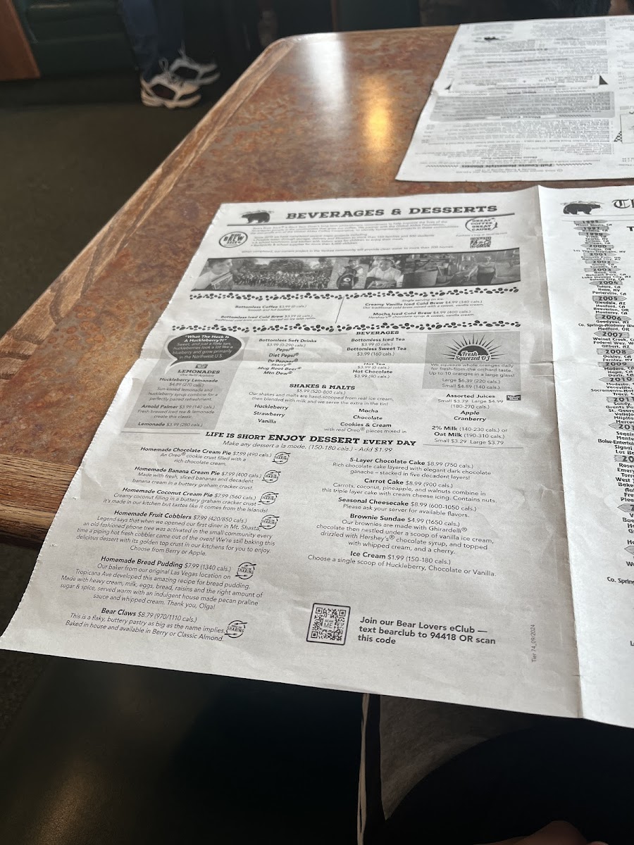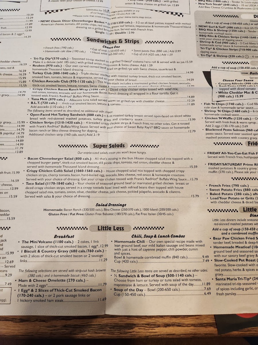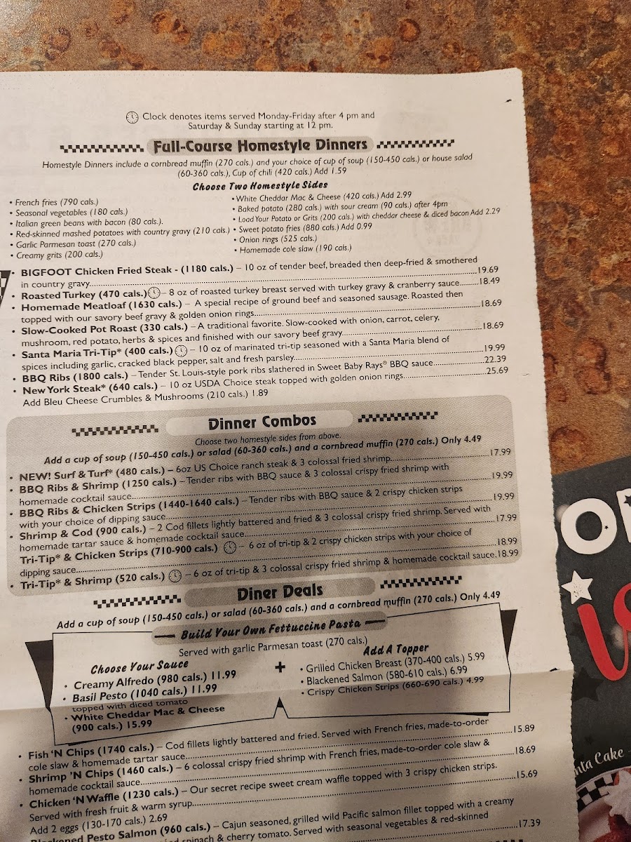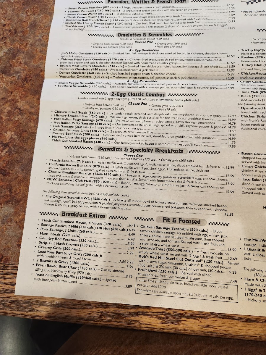 Breakfast invites guests in with warm, generous servings like Chicken and Waffles, Biscuits & Gravy, or Cinnamon Roll French Toast, perfect for starting the day or enjoying a relaxed weekend brunch. Throughout the day, the menu continues with all-American comfort foods such as the Bigfoot Chicken Fried Steak & Eggs, Prime Rib, and a selection of burgers including the Bob's Big Bear Burger and the California Burger on Parmesan Cheese Bread. Family-friendly choices and lighter options, like salads or the Taco Salad with Ground Beef, offer versatility while keeping the focus on approachable, satisfying meals.